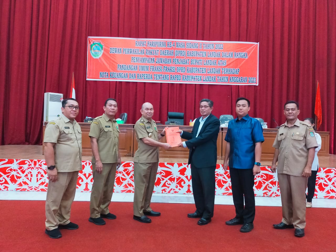 LANDAK – Pj. Bupati Landak Samuel, SE, M.Si menghadiri Rapat Paripurna Ke-4 Masa Sidang II Tahun 2022 DPRD Kabupaten Landak dalam Rangka Penyampaian Jawaban Penjabat Bupati Landak Atas Pandangan Umum Fraksi-Fraksi DPRD Kabupaten Landak Terhadap Nota Keuangan dan Raperda tentang RAPBD Kabupaten Landak Tahun Anggaran 2023 yang diselenggarakan oleh DPRD Kabupaten Landak yang dipimpin oleh Wakil Ketua DPRD Kabupaten Landak Oktapius, SH, MH. Dilaksanakan di Ruang Sidang Utama Kantor DPRD Kabupaten Landak. Senin (21/11/2022).