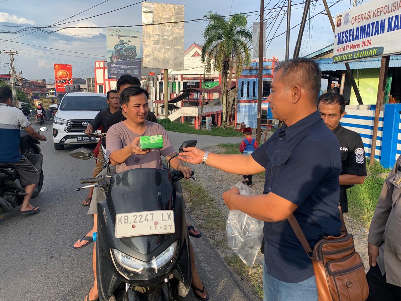 Dalam aksi yang dilakukan di Depan Pos Lantas , Personal Polres Landak dengan senang hati menyambut pengendara yang sedang dalam perjalanan dan membagikan takjil sebagai santapan berbuka puasa.