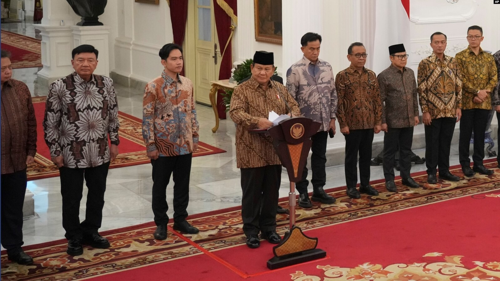 Jakarta (VOA) — “Dengan kesepakatan para ketua umum koalisi kami, kami beri nama kabinet ini Kabinet Merah Putih. Saya ingin umumkan susunan Kabinet Merah Putih periode 2024-2029 sebagai berikut….,” kata Prabowo.Kurang dari sepuluh jam setelah dilantik, Presiden Prabowo Subianto didampingi Wakil Presiden Gibran Rakabuming Raka pada Minggu malam (20/10) mengumumkan nama-nama menteri, wakil menteri dan kepala lembaga di Istana Kepresidenan, Jakarta.
